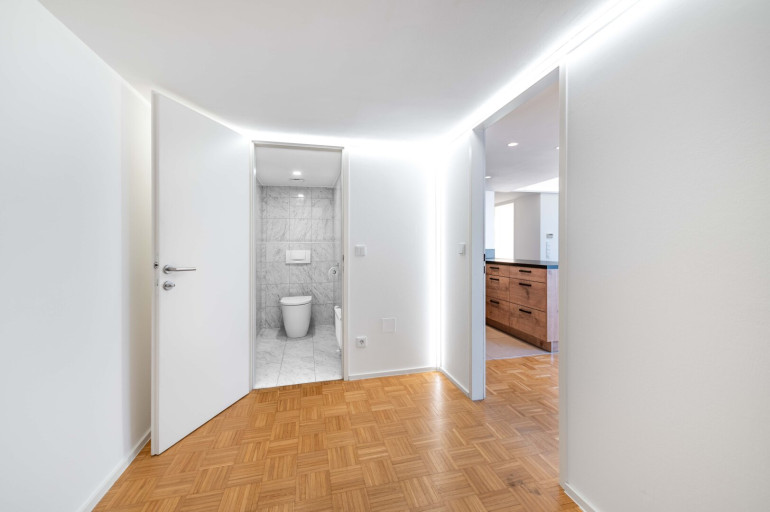 Besonders hervorzuheben sind die hochwertigen Lichtinstallationen, die von einem Lichttechniker geplant und umgesetzt wurden. Diese umfassen unter anderem indirekte Beleuchtung, Spots sowie stimmungsvolle Lichtkonzepte, die der Wohnung eine ganz besondere Atmosphäre verleihen.