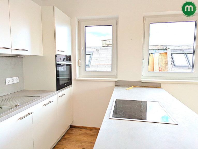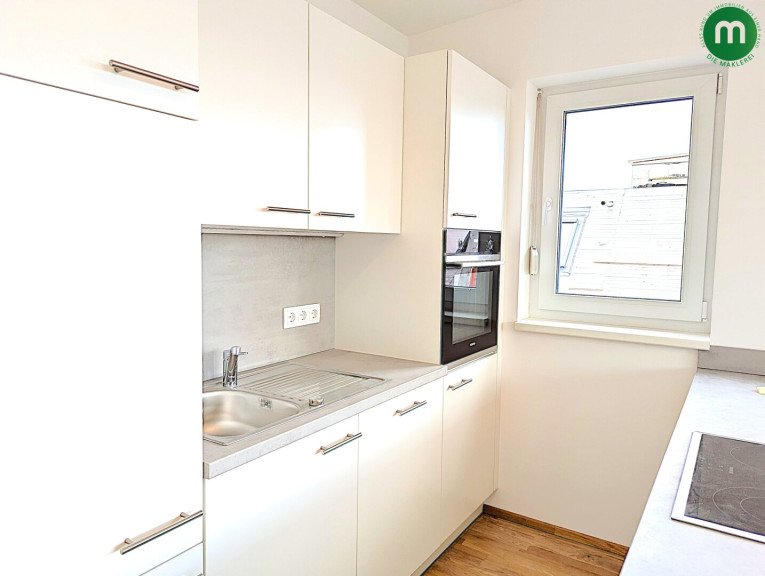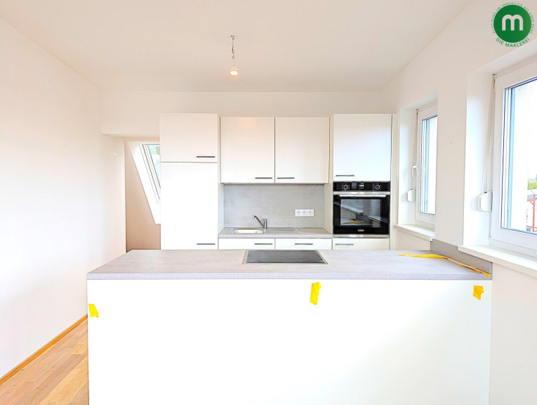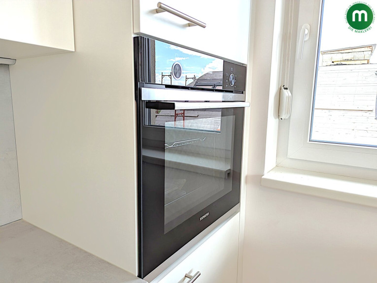 Die Wohnung verfügt über eine weitläufige Wohnküche, die bereits mit einer modernen Einbauküche ausgestattet ist und reichlich Platz für gemütliche Stunden und gesellige Abende bietet. Große Fenster sorgen für lichtdurchflutete Räume und schaffen eine offene, einladende Atmosphäre. Das Badezimmer überzeugt mit elegantem Design, Tageslicht, einer hochwertigen Dusche und WC. Ein praktischer Abstellraum ergänzt das Raumangebot ebenso wie ein eigener Hauswirtschaftsraum, in dem zB Ihre Waschmaschine Platz findet.