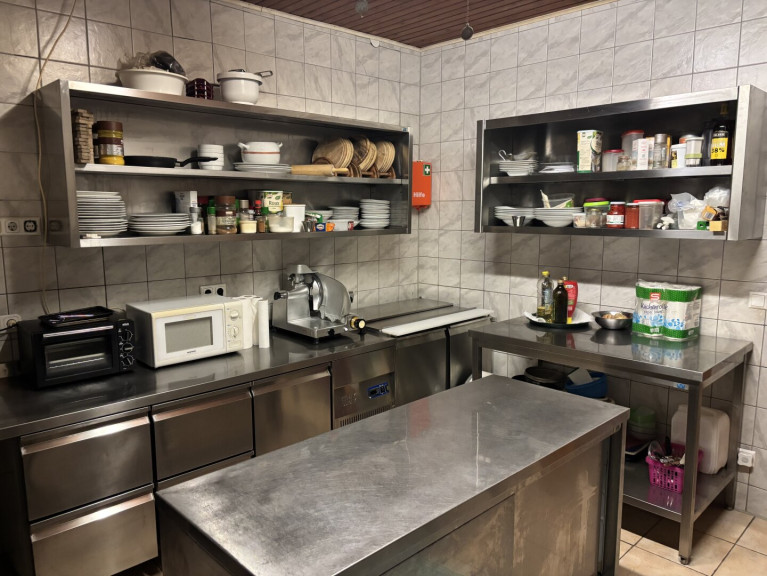Steinboden, Parkett, Fliesen, Elektro, Fußbodenheizung, Heizofen, Einbauküche, Angeschl. Bar, Dusche, Parkplatz, Gastterrasse