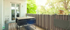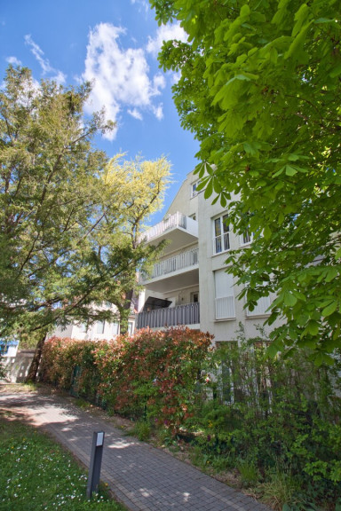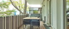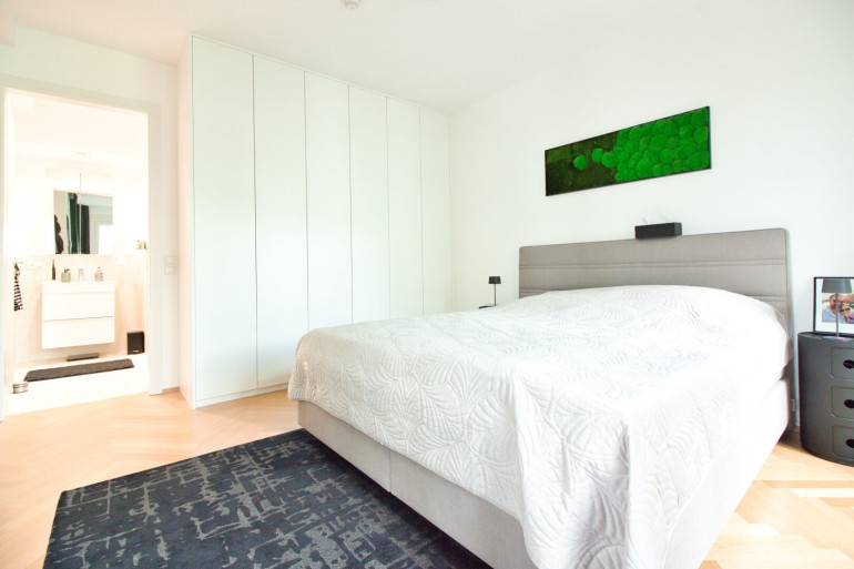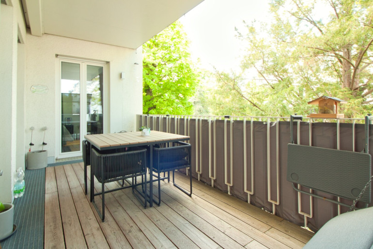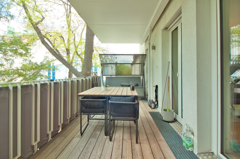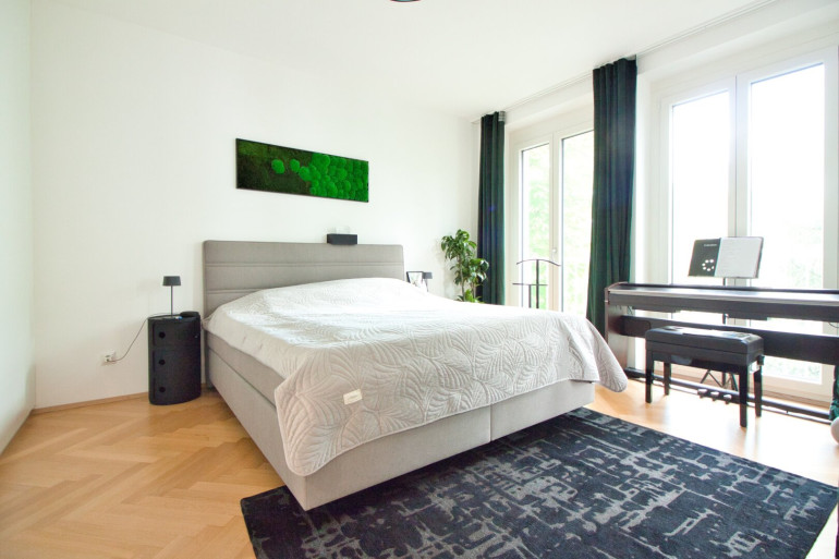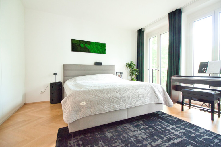 Vom Wohnbereich sowie vom angrenzenden ca. 16 m² großen Master-Bedroom gelangen Sie auf den privaten Balkon mit Blick in den begrünten Innenhof. Umgeben von alten, gewachsenen Bäumen bietet dieser auf ca. 12 m² eine geschützte, private Outdoor-Oase.