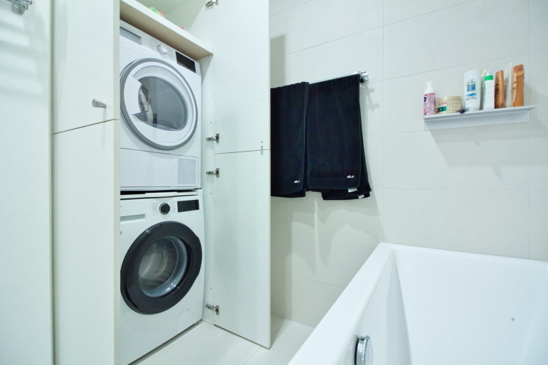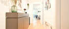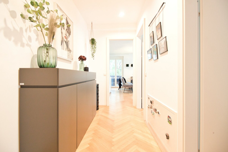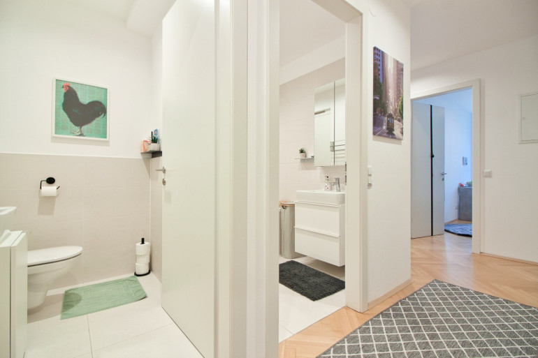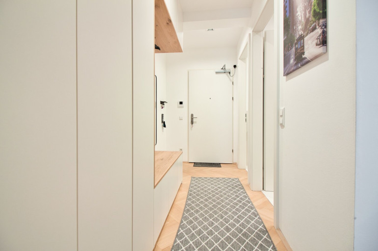 Bereits beim Eintreten über die Sicherheitseingangstüre empfängt Sie ein einladender Vorraum mit einer maßgefertigten Garderobe. Linker Hand befindet sich ein separates WC mit Handwaschbecken, daneben ein geschmackvoll ausgestattetes Badezimmer mit Badewanne und Einbauschrank mit Platz für Waschmaschine und Trockner.