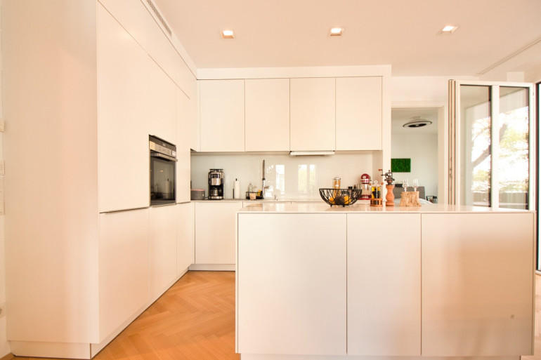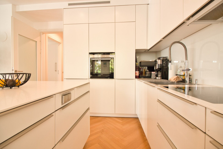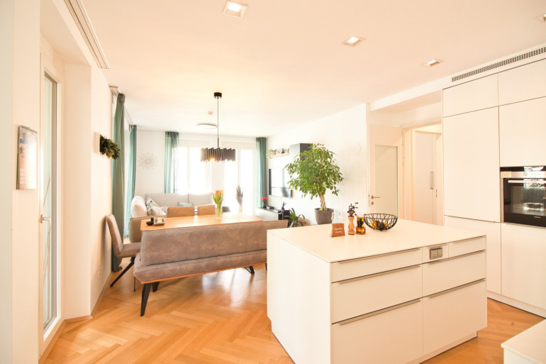 Das Herzstück der Wohnung bildet der rund 33 m² große Wohnbereich: offen, hell und vielseitig gestaltbar. Hier lassen sich Wohnen, Essen und Leben harmonisch vereinen. Die hochwertige EWE-Küche ist bereits integriert und mit Keramikplatte, Siemens-Geräten sowie einem Liebherr-Einbaukühlschrank ausgestattet – funktional und stilvoll zugleich.