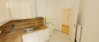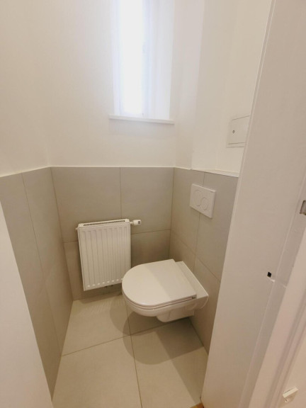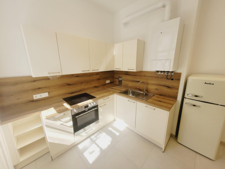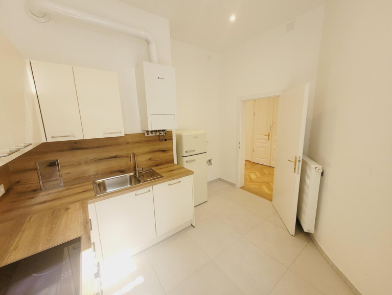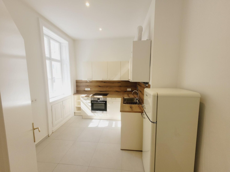 Man betritt die Wohnung über den Vorraum. Linkerhand befindet sich die Küche, eingerichtet mit einer modernen Einbauküche und mit Fenster in den sonnigen Hof. Im Vorraum geradeaus gelangt man ins Zimmer. Auch das Zimmer ist sehr ruhig, da es ebenfalls in den hellen Innenhof ausgerichtet ist. Im Zimmer wurde ein modernes Badezimmer mit Dusche eingebaut. Das WC ist separat.