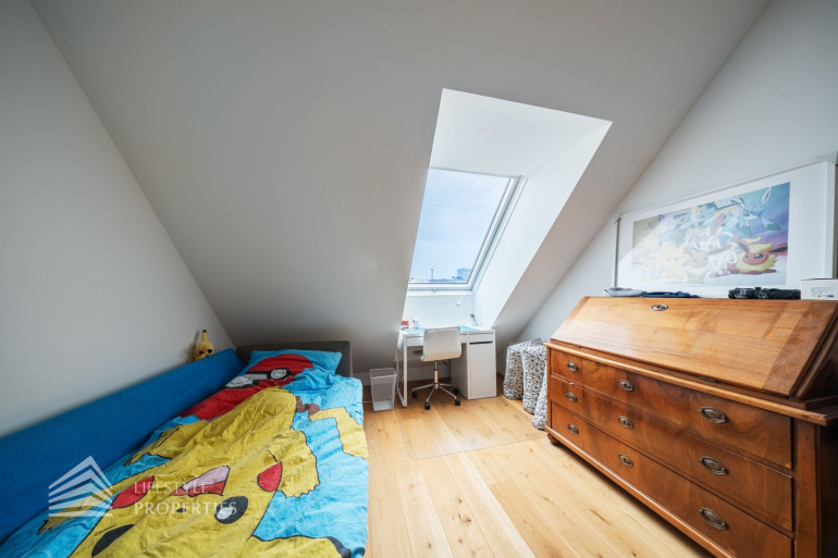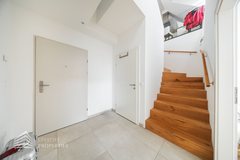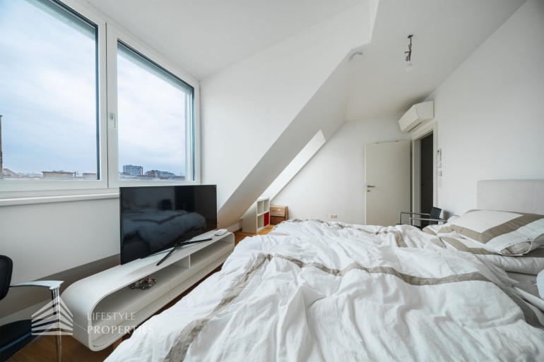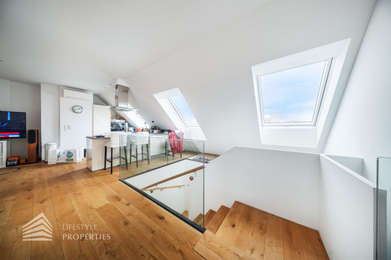 Die Wohnung befindet sich im DG eines im Jahre 1971 erbauten Neubaus und erstreckt sich über eine Wohnfläche von ca. 94 m² und ca. 7 m² privater Terrasse mit einem traumhaften Blick über Wien. Die moderne Immobilie erstreckt sich auf zwei Ebenen. Die Wände der Wohnräume, alle Türen und Fenster sind in zeitlosen Weiß gehalten.