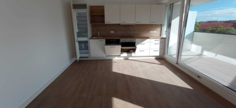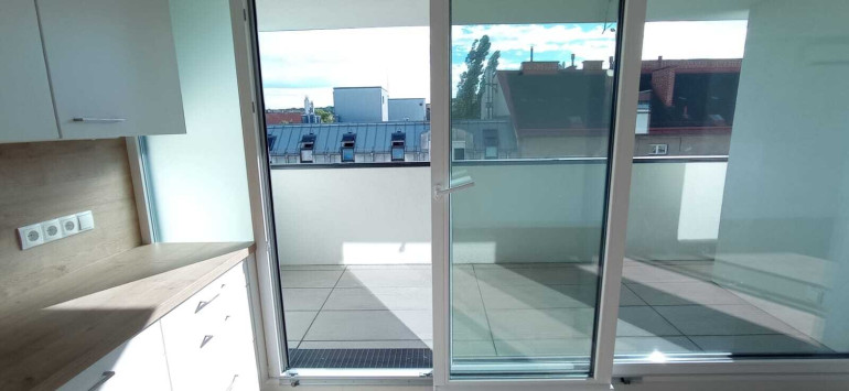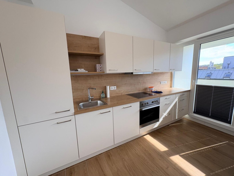 Über den Lift gelangt man äußerst bequem in das Dachgeschoß. Die Wohnung besteht aus einem sehr großen, hellen Wohnraum mit Ausgang auf die Terrasse und Zugang zur angrenzenden Küche, einem Schlafzimmer, einem Bad mit Dusche, Waschbecken und Handtuchtrockner, zwei Abstellräume, einer davon mit WM Anschluss, sowie einer Toilette mit Handwaschbecken und einem Vorraum. Der Wohnung ist ein Kellerabteil zugeordnet.