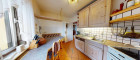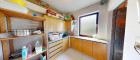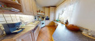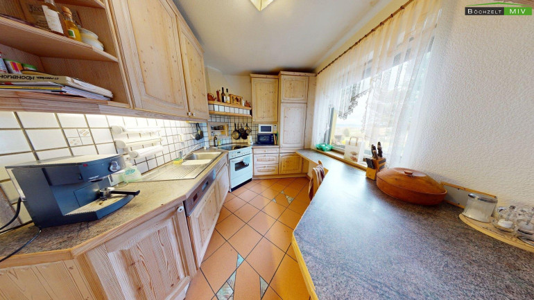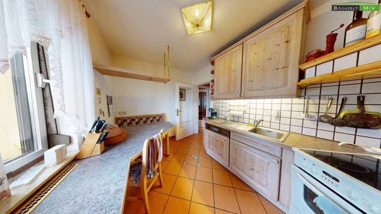 Die Küche ist mit einer gepflegten Vollholzküche samt E-Geräten ausgestattet und verfügt über eine gemütliche Ess-Ecke. Auch hier ist eine Fußbodenheizung vorhanden.