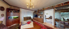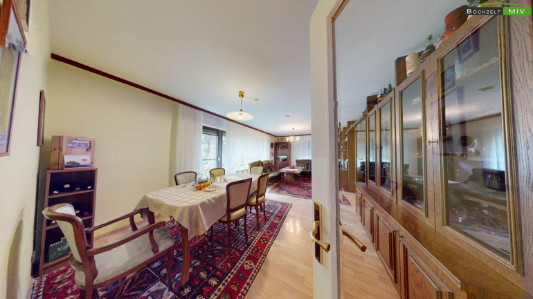 Das Wohnzimmer bietet dank großer Fensterflächen und einer Terrassentür viel Tageslicht und einen direkten Zugang in den Garten. Einbaumöbel aus Vollholz sowie ein Laminatboden prägen den Raum. Neben der Fußbodenheizung sind zusätzliche Heizkörper vorhanden.