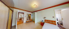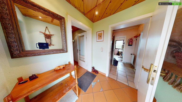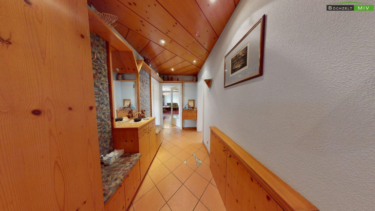 Das Wohnhaus ist nicht unterkellert und erstreckt sich vollständig im Erdgeschoss: Im Eingangsbereich empfängt ein großzügiger Vorraum mit Tischlereinbauten, Holzvertäfelung an der Decke, Einbauspots und gefliestem Boden mit Fußbodenheizung. Von hier aus sind die Wohnräume sowie der Technik- und Nebenraumbereich erschlossen.