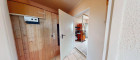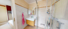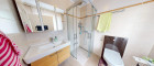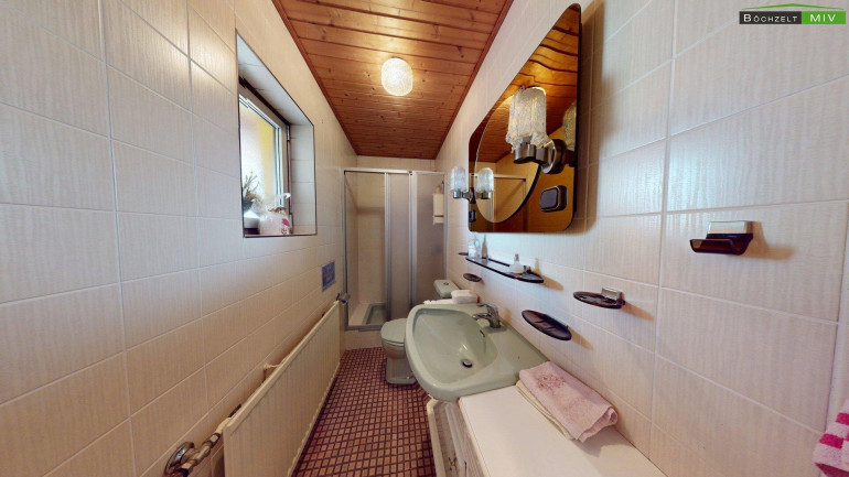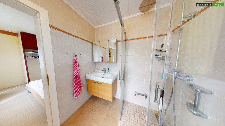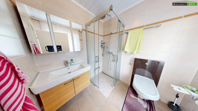 Das Hauptbadezimmer wurde modern saniert und verfügt über eine barrierefreie, bodenebene Dusche, WC, Waschtisch mit Unterschrank und Spiegelschrank (Alibert). Es ist bis zur Decke verfliest, mit Holzvertäfelung an der Decke und Fußbodenheizung ausgestattet.