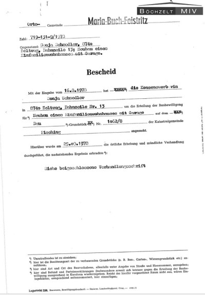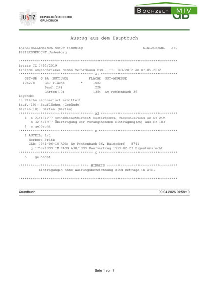 Für das Gebäude ist die Benützungsbewilligung derzeit in Ausarbeitung (samt Nutzungsänderung ehemalige Garage) Die Liegenschaft befindet sich im Verlassenschaftsverfahren nach Herbert Fritz. Der Kaufvertrag kann voraussichtlich ab Juni 2026 unterfertigt werden, sobald das Verfahren abgeschlossen ist.