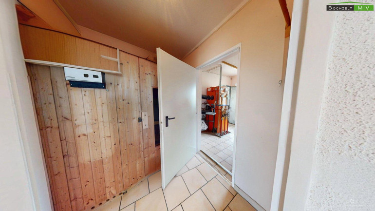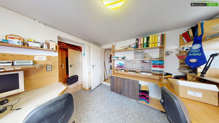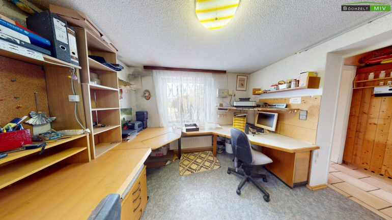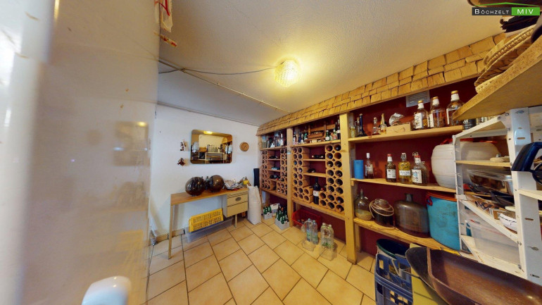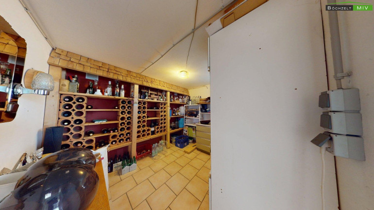 Die ehemals als Garage genutzte Fläche im Haus wurde vom Vorbesitzer zu einem Büro sowie einem Weinkeller mit gefliestem Boden umgebaut. Hier befindet sich auch ein kleines Badezimmer mit Dusche, WC und Waschtisch.