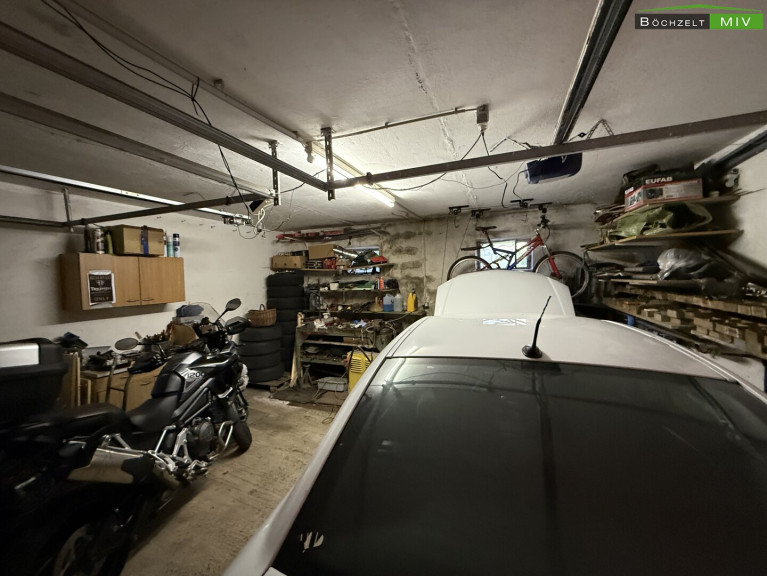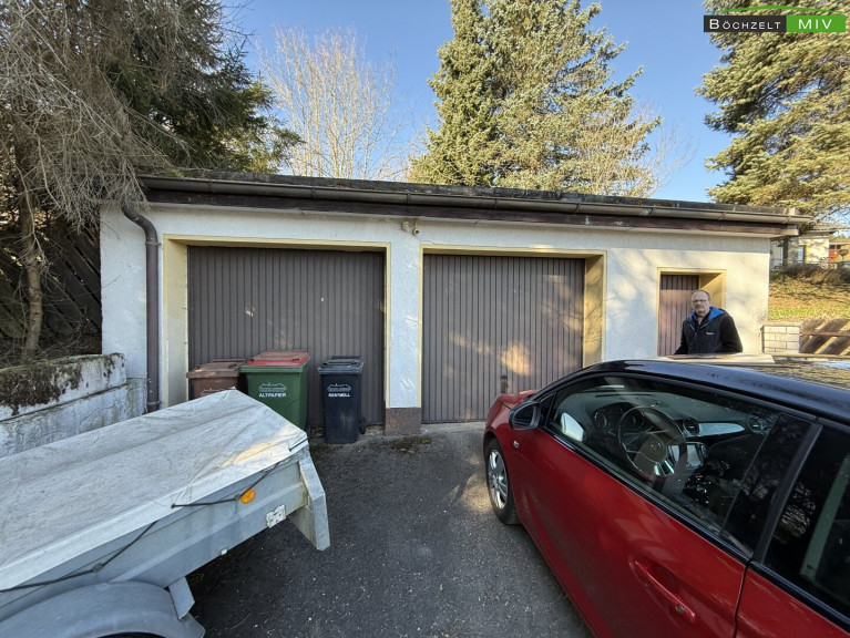 Die Garage (Baujahr 1991) in Massivbauweise mit Flachdach ist als Doppelgarage mit zwei Stellplätzen konzipiert. Laut Gutachten bestehen jedoch Feuchtigkeits- und Durchfeuchtungsschäden an der hangseitigen Rückwand und im Deckenbereich. Das Garagengebäude wird daher als sanierungsbedürftig eingestuft; die elektrischen Garagentore sind nicht funktionsfähig. Auf dem Grundstück stehen zusätzliche Stellmöglichkeiten im Freien zur Verfügung.