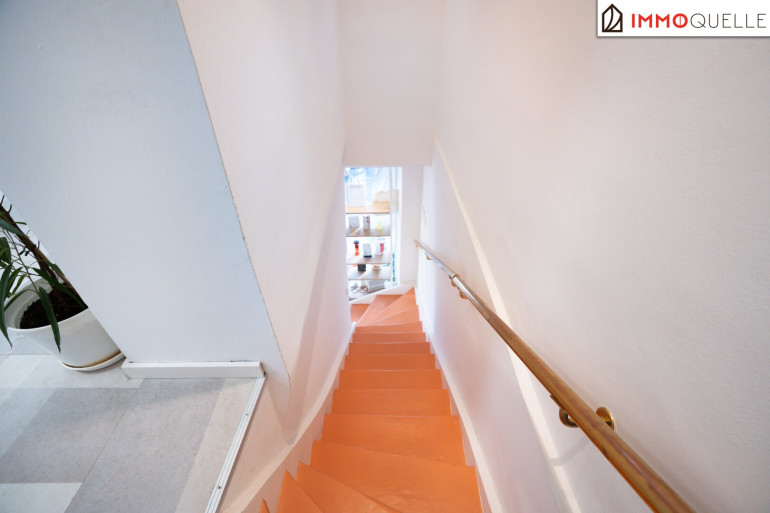Über eine interne Treppe ist das Erdgeschoss direkt mit dem Obergeschoss verbunden. Hier befindet sich eine weitläufige Fläche, die aktuell als Büro- und Nebenfläche genutzt wird. Die Aufteilung umfasst mehrere Bereiche inklusive Küche, Lagerraum, Bürofläche, WC sowie Abstellraum. Diese Struktur ermöglicht eine flexible Nutzung und schafft funktionale Ergänzungsflächen zur Geschäftszone im Erdgeschoss.