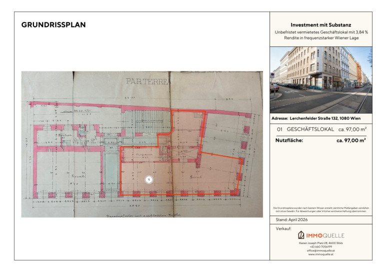In einer lebendigen Wiener Lage, geprägt von urbanem Flair und konstanter Frequenz, präsentiert sich dieses Geschäftslokal als attraktive Gelegenheit für Investoren, die auf eine Kombination aus laufenden Mieteinnahmen und nachhaltigem Entwicklungspotenzial setzen.