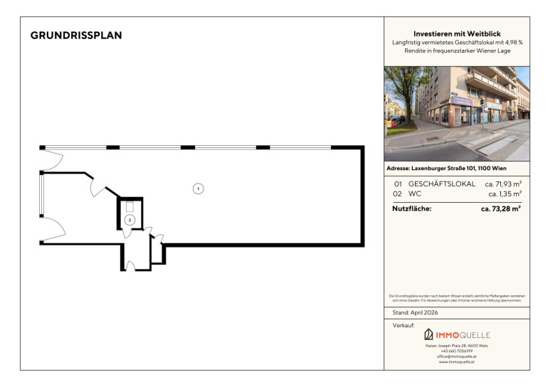 Lage? Die Liegenschaft befindet sich in der Laxenburger Straße 101, 1100 Wien - einer stark frequentierten Verkehrsader mit ausgezeichneter Sichtbarkeit und hervorragender Anbindung. Die Umgebung ist geprägt von einer dichten Wohnbebauung, vielfältigen Gewerbebetrieben sowie einer konstant hohen Passantenfrequenz. Durch die gute Erreichbarkeit sowohl mit öffentlichen Verkehrsmitteln als auch mit dem Individualverkehr profitiert der Standort von einer nachhaltigen Kundenfrequenz - ein entscheidender Faktor für den langfristigen Geschäftserfolg des Mieters und damit für Ihre Investition.