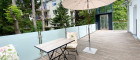 Vom Schlafzimmer aus gelangt man auf die zweite, private Terrasse – ein perfekter Rückzugsort für entspannte Stunden mit Blick ins Grüne.