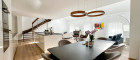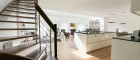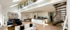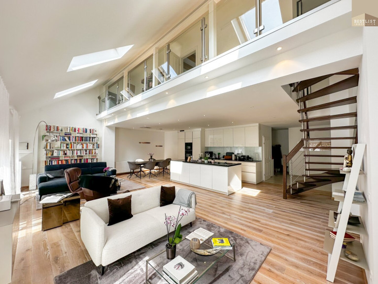 Über eine schöne Treppe gelangt man in das Obergeschoß, wo eine offene Galerie Platz für einen stilvollen Arbeitsplatz oder ein Atelier schafft. Durch den offenen Blick in den darunterliegenden Wohnraum entsteht ein besonders luftiges und repräsentatives Wohngefühl.