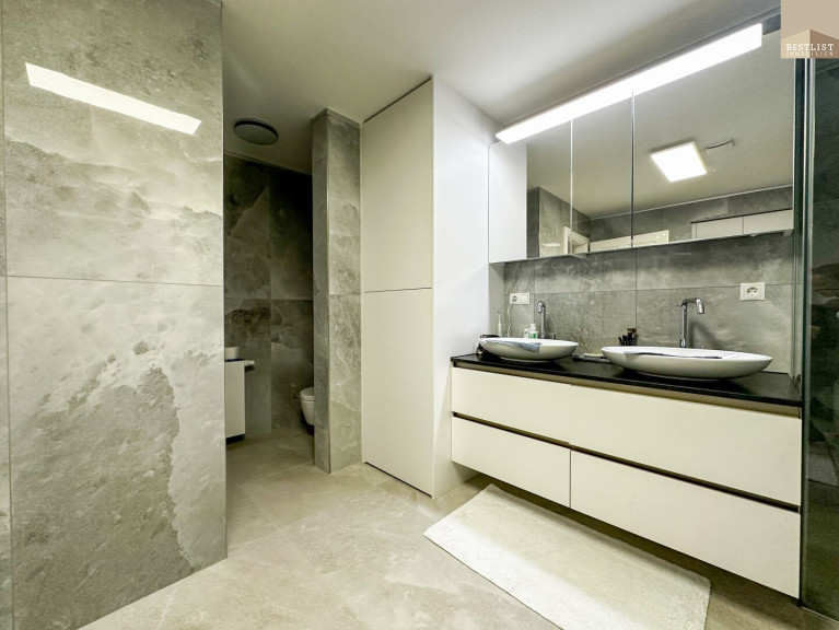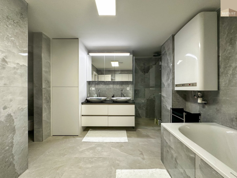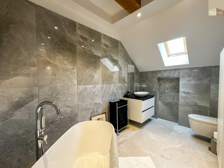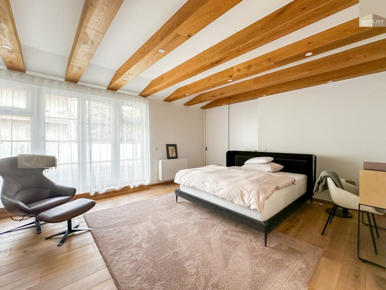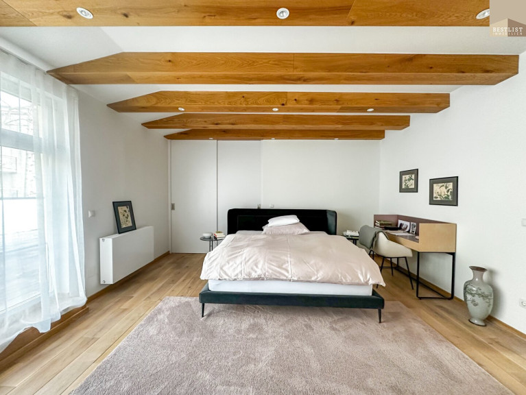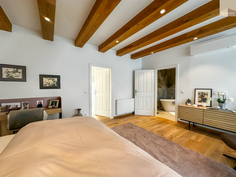 Das großzügige Schlafzimmer überzeugt durch seine ruhige Lage sowie einen maßgefertigten, beleuchteten Einbauschrank. Das angrenzende Badezimmer mit freistehender Badewanne ist ein echtes Highlight.