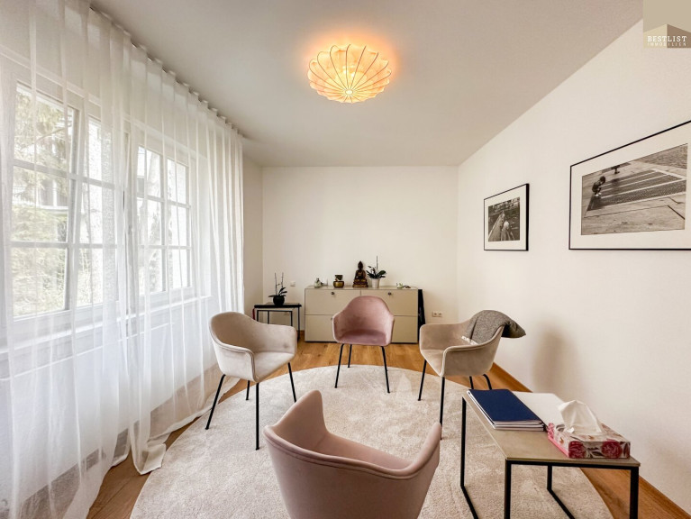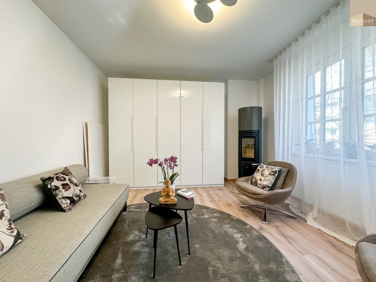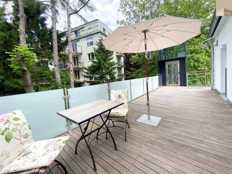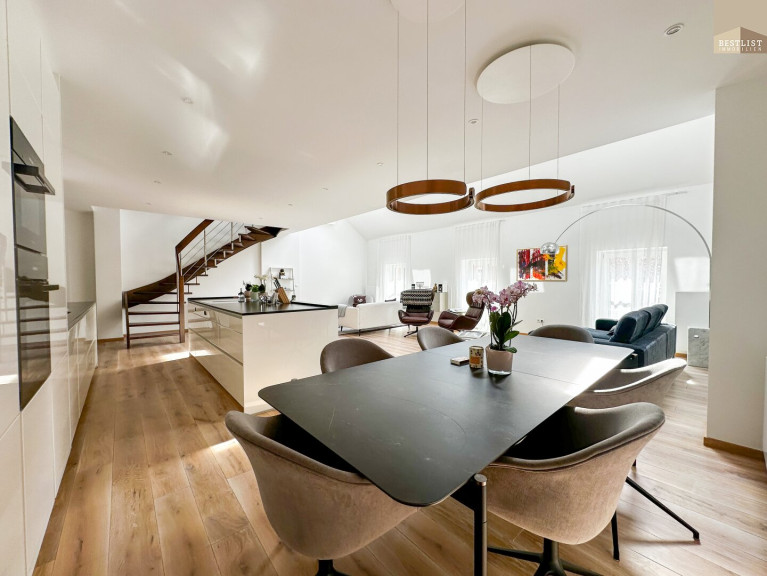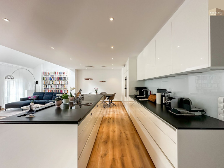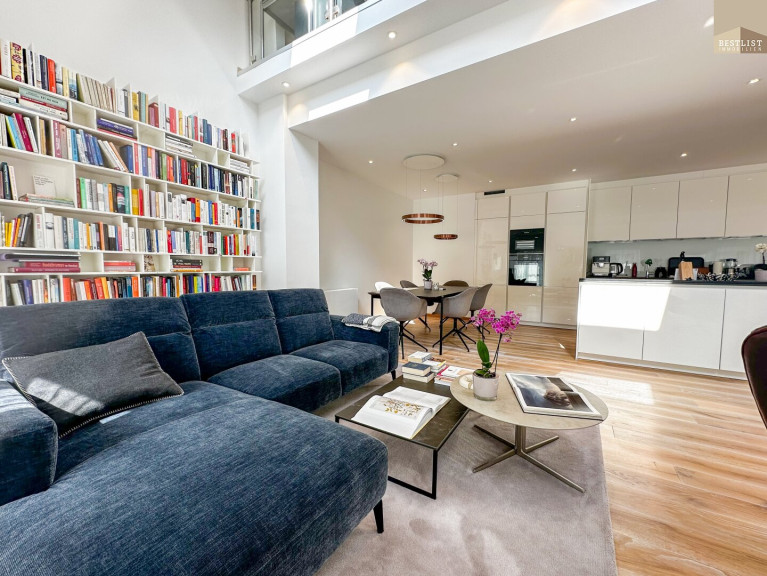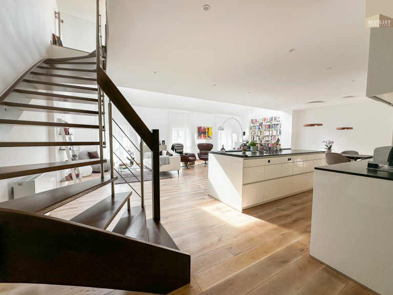 Die stilvolle Wohnung erstreckt sich über ca. 188 m² Wohnfläche auf zwei Ebenen, zusätzlich zwei Terrassen, ein Garten und ein Parkplatz. Die Wohnung überzeugt durch ihre lichtdurchfluteten Räume sowie eine hochwertige Ausstattung mit viel Liebe zum Detail.