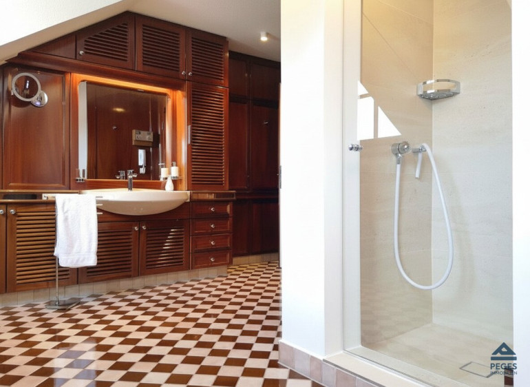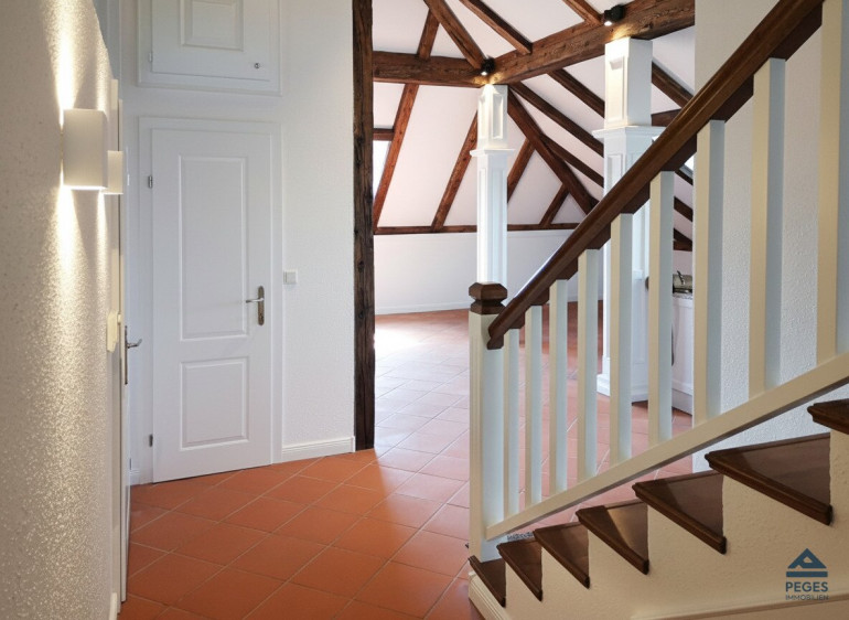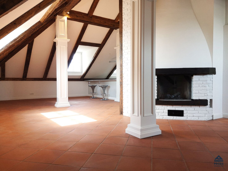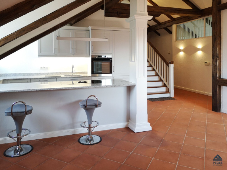 Die Wohnung, die im 4.OG und somit dem Dachgeschoß eines historischen Wohnhauses mit Lift (-mit direktem Exklusiv-Zugang zur Wohnung) gelegen ist, besticht neben der ausgesprochen zentralen Lage durch die gelungene Symbiose von Modernität und Geschichtsträchtigkeit, die sich in der durchdachten Gestaltung der Räumlichkeiten sowie der außergewöhnlichen Ausstattung widerspiegelt. In der Wohnung sorgen edle Materialien und eine exklusive Ausstattung in den Wohnräumlichkeiten für ein extravagantes Wohnambiente: schöne Holzbalken sowie maßgefertigte Einbauten im Schlaf- und Wohnbereich, Sauna und Wannengrotte im großzügigen Badezimmer, ein gemütlicher Effektfeuer-Kamin (mit Fernbedienung) im Wohnzimmer und zahlreiche LED-Beleuchtungen an Decken und Wänden sorgen für ein besonderes Flair.