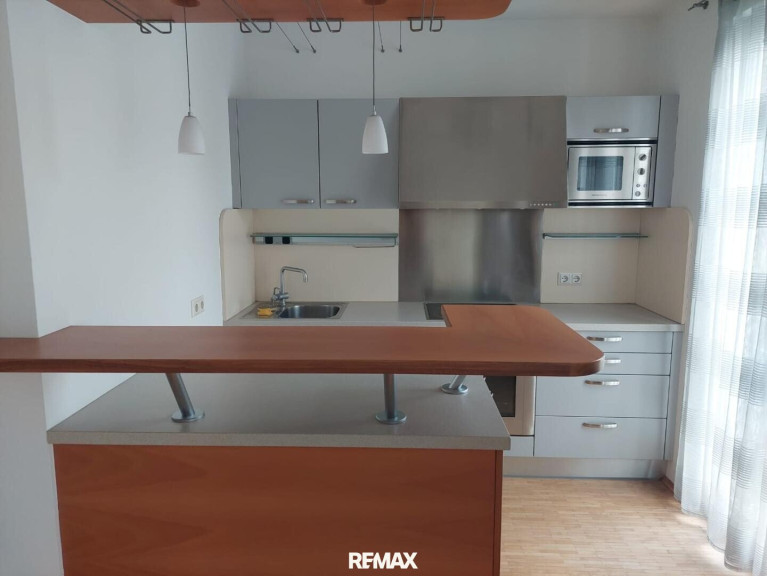 Die Einbauküche samt Elektrogeräten und einladender Bar sowie ein Kellerabteil sind in der Miete inkludiert.