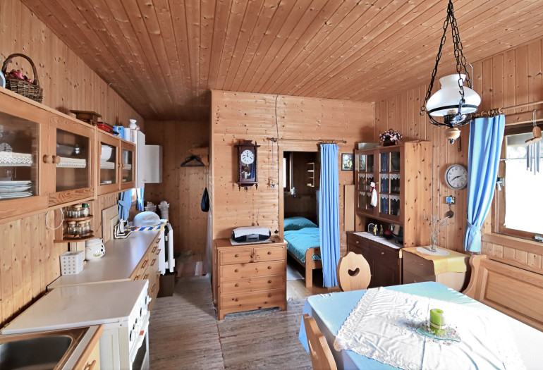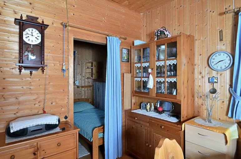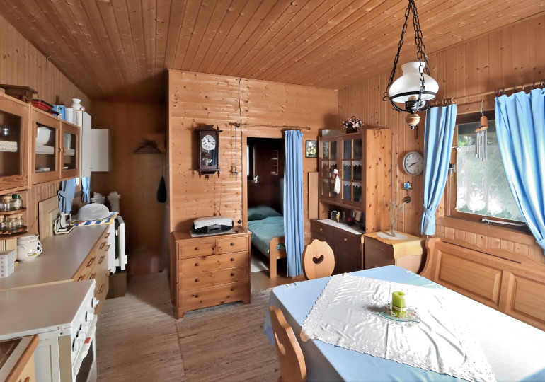 Das Objekt teilt sich auf in Wohnzimmer-/Esszimmer, Schlafzimmer und Badezimmer mit WC. (Separate Gartenhütte mit Campingtoilette.)