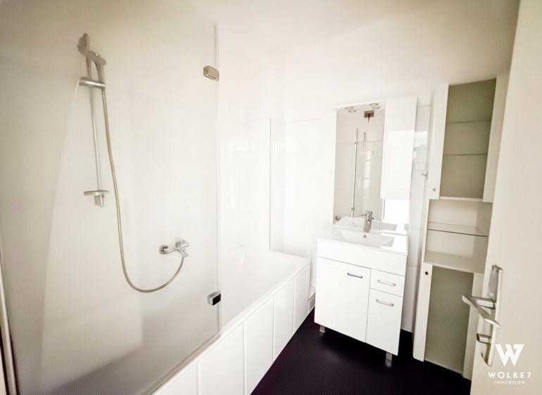 Badezimmer und WC sind getrennt begehbar. Maßgefertigte Tischlermöbel im Vorraum schaffen zusätzlichen Stauraum und unterstreichen die hochwertige Ausstattung.