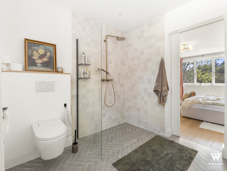 Neben zwei weiteren Zimmern bildet der Masterbereich ein echtes Highlight. Mit eigener Ankleide, stilvollem Badezimmer, maßgefertigtem Doppelwaschtisch und moderner Duschtoilette entsteht hier ein privater Rückzugsort, der Komfort und Eleganz vereint.