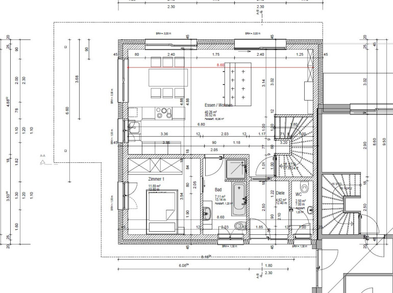 Dielenboden, Fliesen, Erdwärme, Solarenergie, Fußbodenheizung, Einbauküche, Bad mit Fenster, Dusche, Garage, Parkplatz
