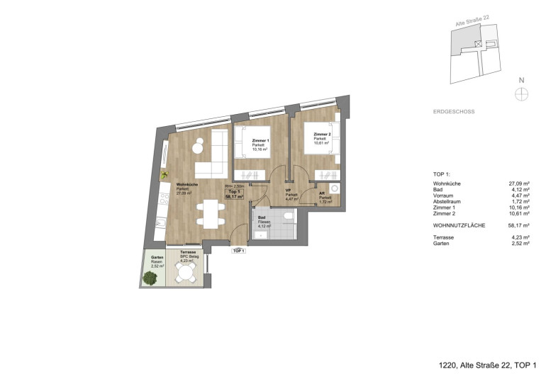 Die Terrasse (ca. 4,23 m²) und der Eigengarten (ca. 2,52 m²) erweitern den Wohnraum ins Freie und schaffen zusätzlichen Wohnkomfort.
