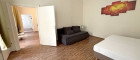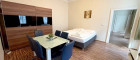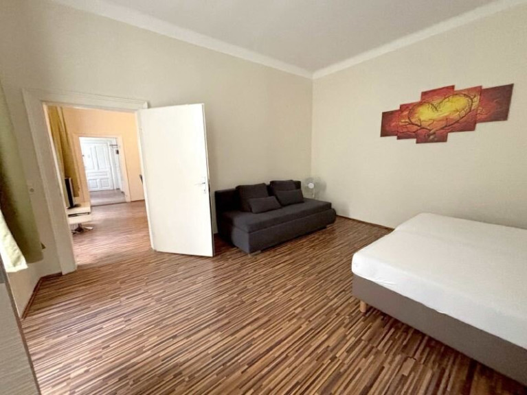 Das geräumige, lichtdurchflutete Wohnzimmer ist mit einem Esstisch, einem Kleiderschrank, einem TV, sowie einem Bett ausgestattet. Im angrenzenden, ebenfalls sehr weitläufigen, hellen Schlafzimmer, befinden sich aktuell eine Schlafcouch, sowie ein weiteres Doppelbett. Aktuell bietet die Wohnung Schlafgelegenheiten für bis zu 6 Personen.
