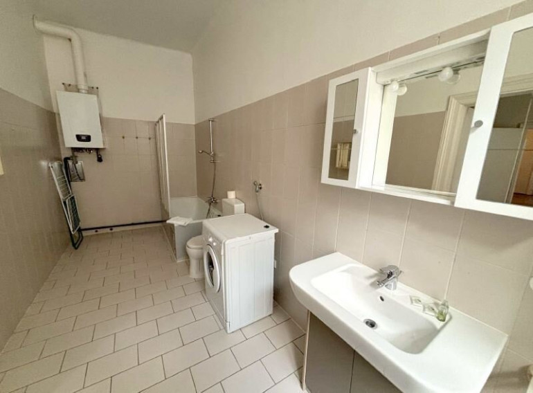 Zuletzt gelangt man in das Badezimmer mit Wanne, Handwaschbecken, WC und sehr gut erhaltener Waschmaschine.