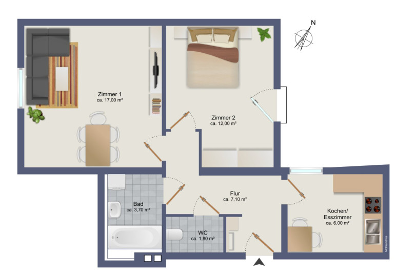 - Flur: Zentraler Eingangsbereich, von dem alle Räume bequem erreichbar sind.