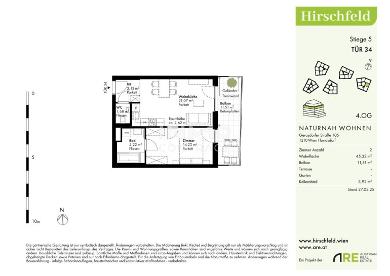 Naturnah und gut angebunden Hirschfeld ist ein beschauliches Viertel am Wiener Stadtrand. Die Metropole im Rücken verheißt jedem Nachhausekommen ein Naturerlebnis und Entspannung. Wer gerne mit den Wiener Linien unterwegs ist, nimmt am besten die Autobuslinie 32A ab Kollarzgasse bis zum U- und S-Bahn-Knotenpunkt Leopoldau. Von hier aus ermöglichen die U1 in Richtung Zentrum sowie die Schnellbahnlinien S1, S2 und S7 eine rasche Verbindung stadtein- und stadtauswärts. Alternativ verläuft die Straßenbahnlinie 31 entlang der Brünner Straße über Floridsdorf direkt bis Schottenring. Autofahrer profitieren von der nahegelegenen A22. Geschäfte des täglichen Bedarfs direkt ums Eck, das benachbarte Ella Lingens Gymnasium und die Nähe zum Marchfeldkanal sorgen für ein rundum ausgewogenes Leben.