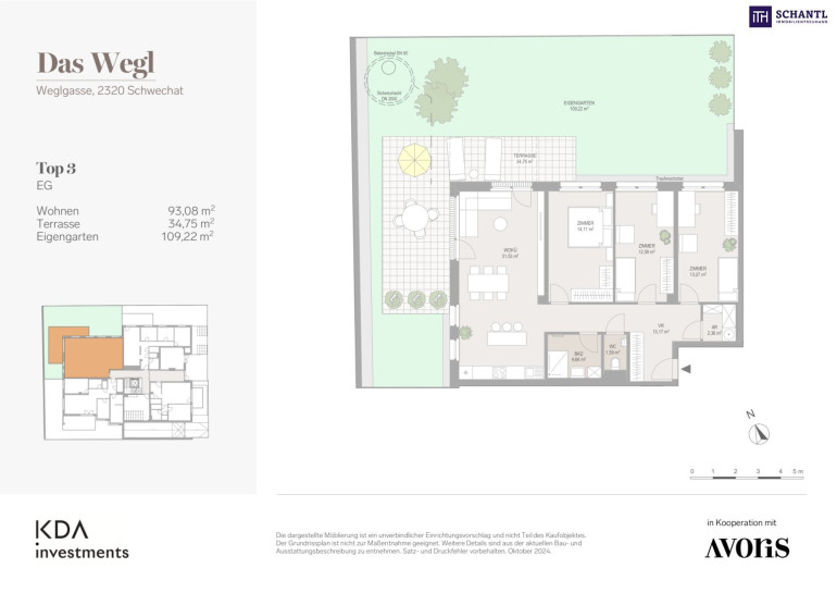 Wohnfläche: ca. 93,08 m² + Terrasse: ca. 34,75 m² + Garten: ca. 109,22 m² + Kellerabteil: ca. 2,55 m²