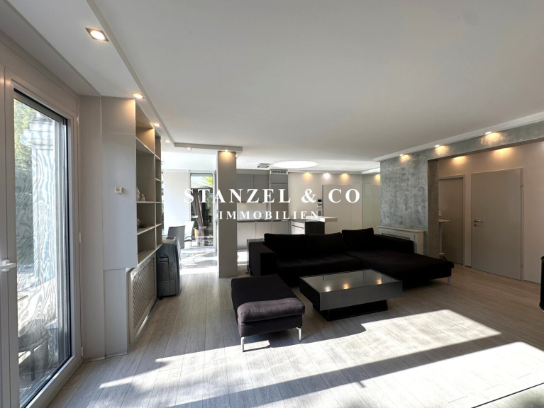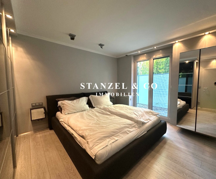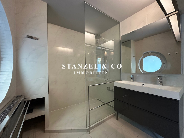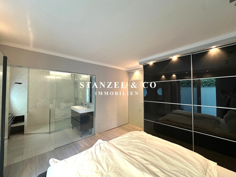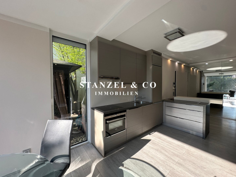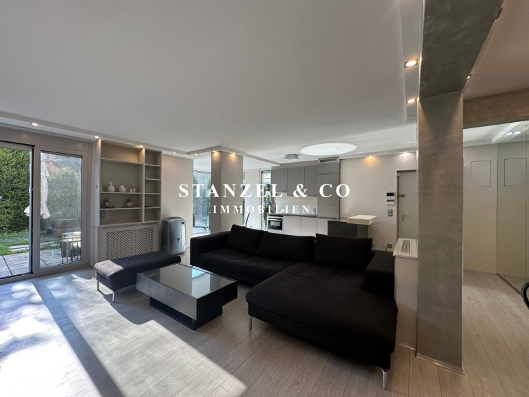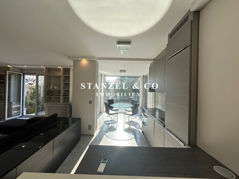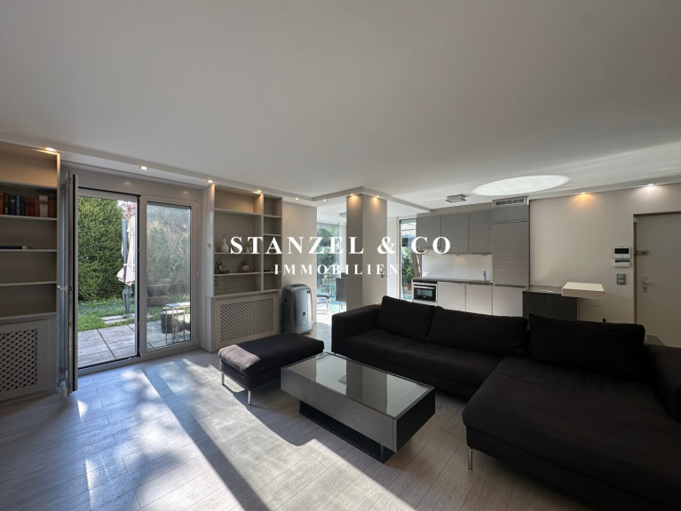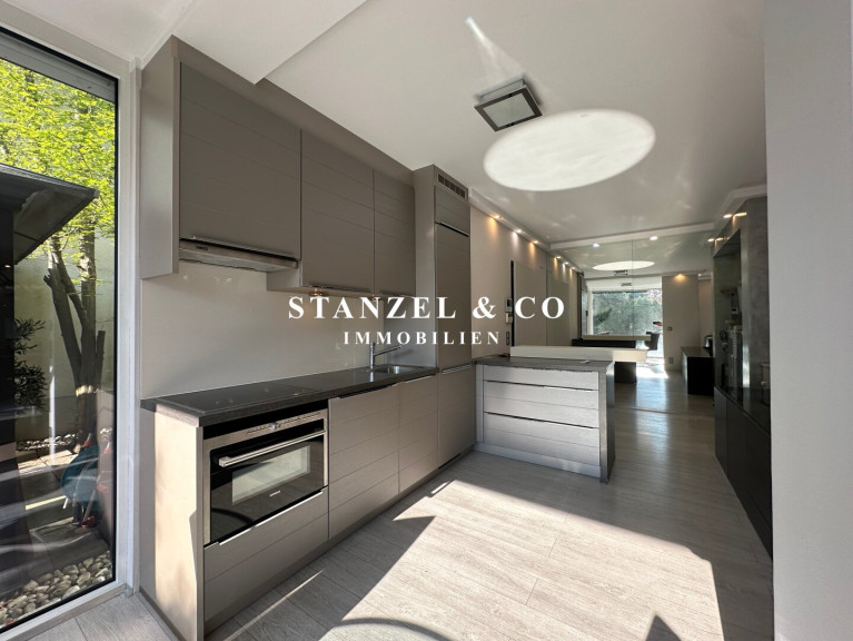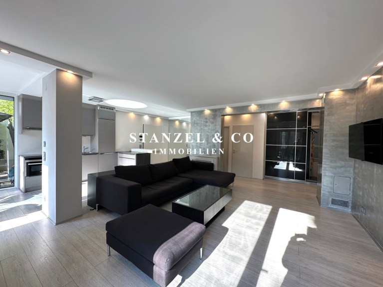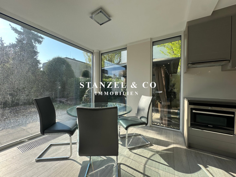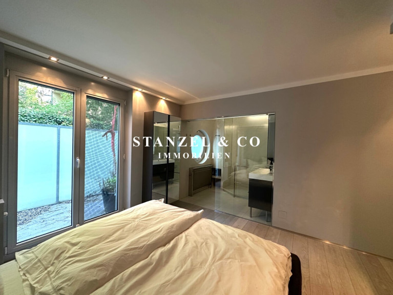 Das sonnige 46m² große, ostseitige Wohnesszimmer verfügt über eine offene Küche, eine Ostterrasse mit anschließendem Garten und einen Wintergarten. Die offene Küche ist mit einem Geschirrspüler, Dunstabzug, Ceranfeld, Backrohr und einer Kühl-Gefrierkombination ausgestattet - der anschließende Wintergarten bietet Platz für einen Essbereich. Die großen Terrassentüren verbinden das großzügige Wohnesszimmer mit dem schönen, großen Ostgarten. An das 17m² große Schlafzimmer schließt der kleine Westgarten sowie das Badezimmer an. Das 5m² große Badezimmer ist mit dem Schlafzimmer durch großzügige Glasschiebeelemente verbunden und verfügt über eine Glasdusche mit Regenduschkopf, eine elektrische Entlüftung, einen Spiegelschrank, Doppelwaschtisch mit Unterschrank und ein Fenster. Des Weiteren gibt es ein separates WC.