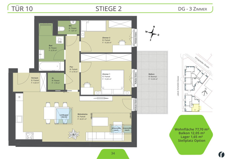 Die Dachgeschosswohnung Top 2/10 ist ostseitig gelegen und bietet Ihnen auf ca. 77,7m2 3 Zimmer, einen ca. 12,05 m2 großen Balkon, Anschlüsse für eine offene Küche im Wohnzimmer, ein Badezimmer mit Badewanne und Walk-in Dusche und Waschmaschinenanschluss, ein separates WC sowie einen Abstellraum.