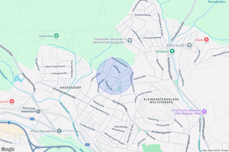 Zum Verkauf gelangt ein ca. 1.290 m² großes Grundstück mit kleinem Altbestand in begehrter Wohnlage am Wolfersberg im 14. Bezirk. Die Liegenschaft befindet sich in einer ruhigen, gewachsenen Umgebung mit viel Grün, altem Baumbestand und überwiegend Einfamilienhäusern.