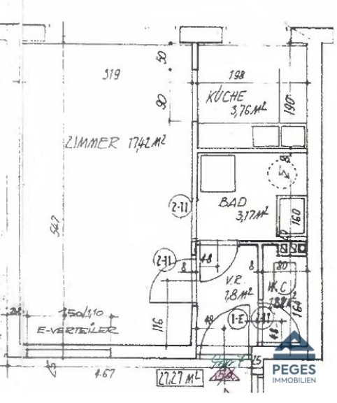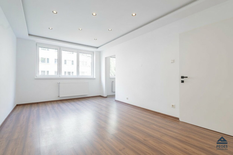 Über den Eingangsbereich/ Vorraum gelangt man in die Sanitärbereiche (Bad, WC getrennt) sowie den Wohnraum. Durch die abgehängte Decke mit Einbauspots und dem gepflegten Vinylboden ist ein modernes Design gegeben. Der separate Küchenbereich (mit Fenster) bietet Platz zur Einrichtung einer neuen Küchenzeile (-dzt. nicht eingerichtet). Der Sanitärbereich ist teilsaniert und mit zeitgemäßen Fliesen ausgestattet - Dusche und WM-Anschluss sind vorhanden; (dzt. kein Waschbecken montiert). Das getrennte WC ist mit hellen zeitlosen Fliesen ausgestattet.