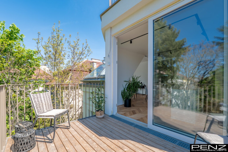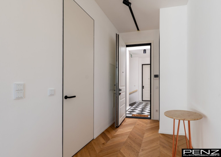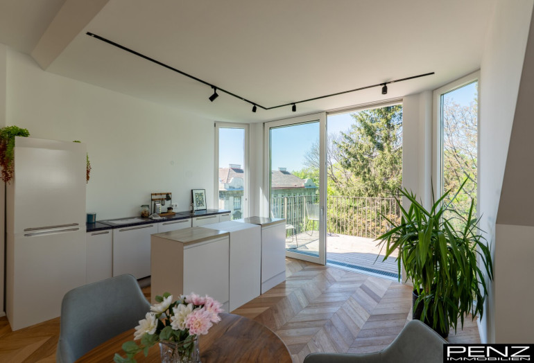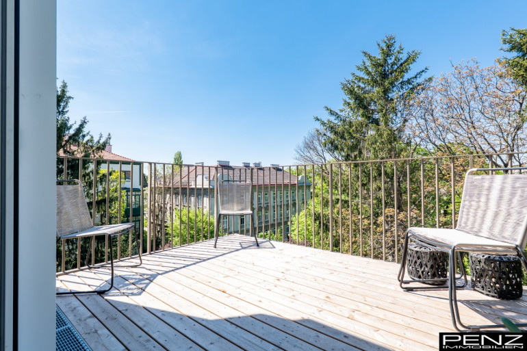 This stunning Viennese period apartment has been completely renovated and remodeled in a modern architectural style. The 3-room apartment offers 92 m² of living space, an 8 m² south-west facing balcony, and a 56 m² roof terrace with panoramic views of Vienna!
