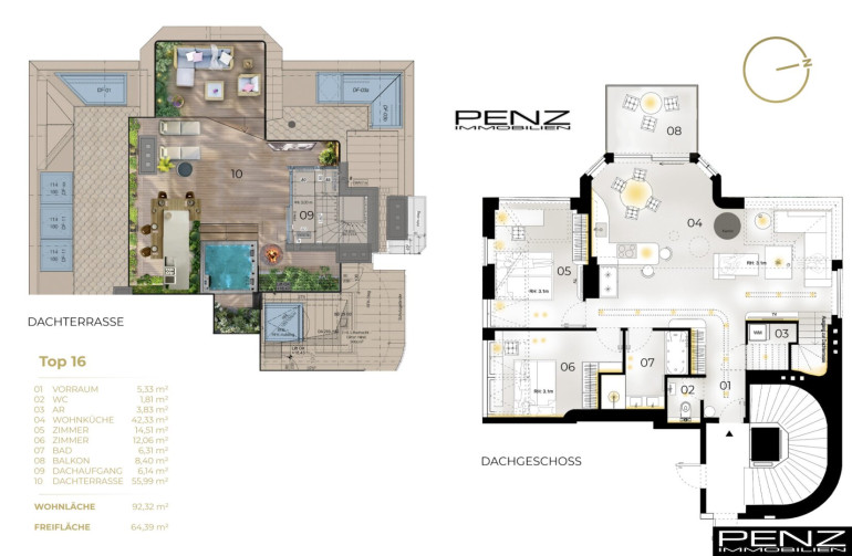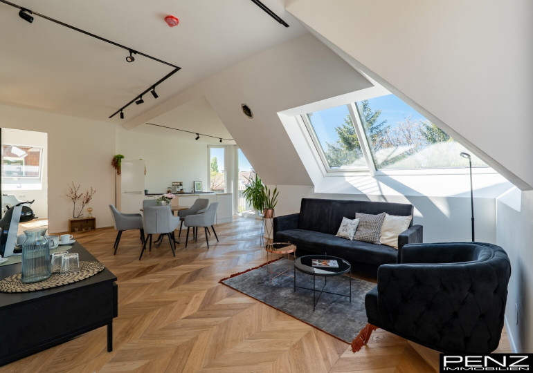 This apartment can also be expanded by connecting it to the adjacent apartment (also still available) to create a penthouse with 5 rooms + 2 bathrooms/WCs, offering approx. 148 m² of living space plus 103 m² of outdoor space (roof terraces + balcony) – a unique opportunity!