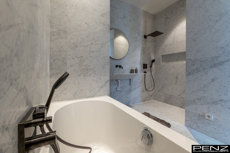 - Bad in Carrara-Marmor mit Dusche und Badewanne. Design-Armaturen, ca. 6,3 m2