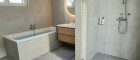 Parkett, Fliesen, Badewanne, Dusche, Bad mit Fenster