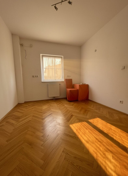 In den Wohnräumen sorgt edles Fischgrätparkett für ein besonders stilvolles Ambiente. Diese klassische Verlegeart unterstreicht die Wertigkeit der Immobilie und verleiht den Räumen eine warme, elegante Ausstrahlung.