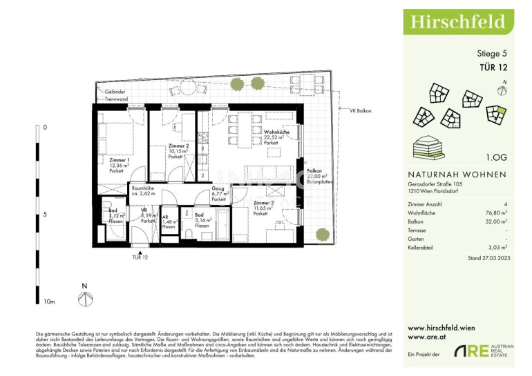 Naturnah und gut angebunden Hirschfeld ist ein beschauliches Viertel am Wiener Stadtrand. Die Metropole im Rücken verheißt jedem Nachhausekommen ein Naturerlebnis und Entspannung. Wer gerne mit den Wiener Linien unterwegs ist, nimmt am besten die Autobuslinie 32A ab Kollarzgasse bis zum U- und S-Bahn-Knotenpunkt Leopoldau. Von hier aus ermöglichen die U1 in Richtung Zentrum sowie die Schnellbahnlinien S1, S2 und S7 eine rasche Verbindung stadtein- und stadtauswärts. Alternativ verläuft die Straßenbahnlinie 31 entlang der Brünner Straße über Floridsdorf direkt bis Schottenring. Autofahrer profitieren von der nahegelegenen A22. Geschäfte des täglichen Bedarfs direkt ums Eck, das benachbarte Ella Lingens Gymnasium und die Nähe zum Marchfeldkanal sorgen für ein rundum ausgewogenes Leben.