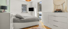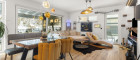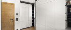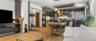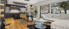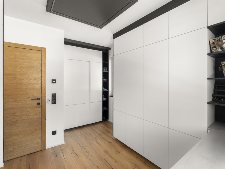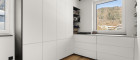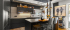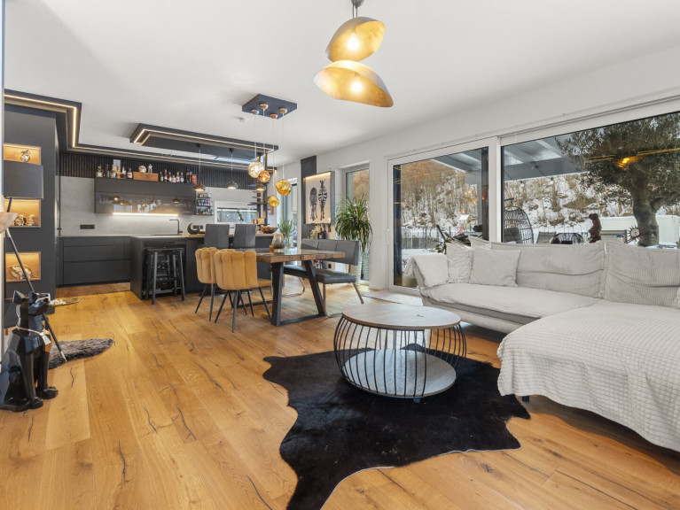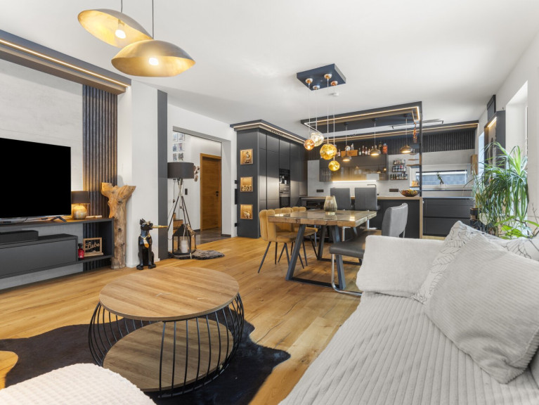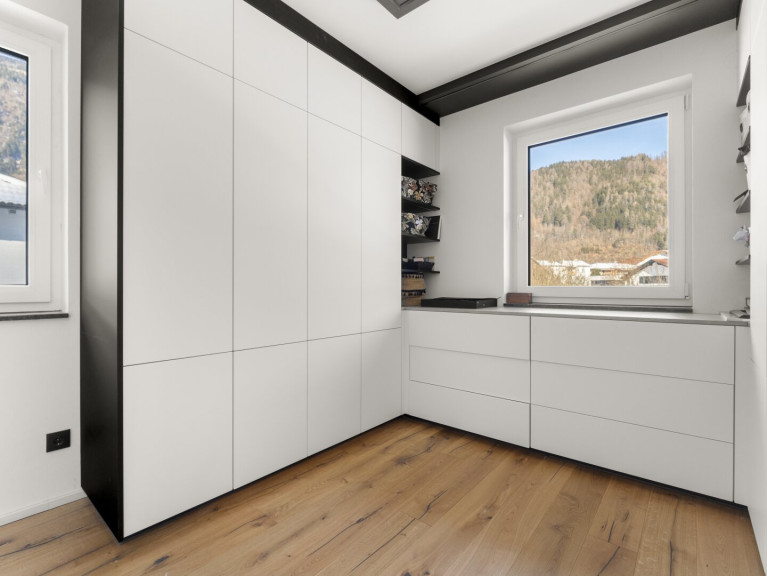 Die Designerküche fügt sich nahtlos ein, der maßgefertigte Schrankraum vom Tischler sorgt für Ordnung