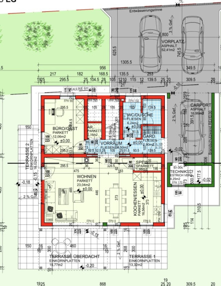 Fliesen, Parkett, Fußbodenheizung, Einbauküche, Wohnküche / offene Küche, Bad mit Fenster, Badewanne, Dusche, Carport, Parkplatz
