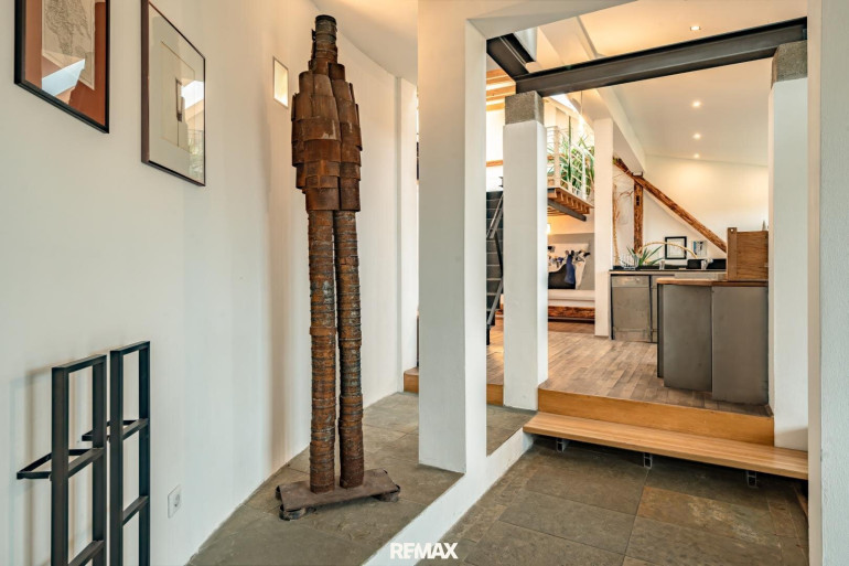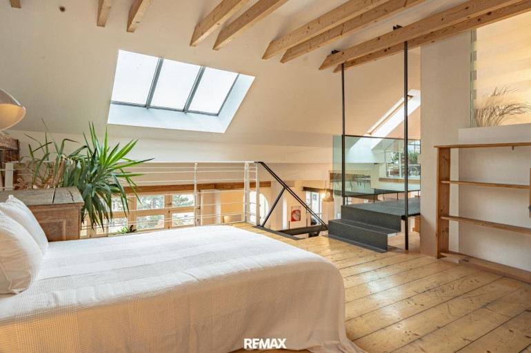Ein stilvoller Treppenaufgang führt Sie direkt auf die Galerie der oberen Ebene. Hier eröffnet sich ein weitläufiger Galeriebereich, der als Bibliothek, Arbeitsplatz oder Ruhezone genutzt werden kann – perfekt für kreative Köpfe und solche, die einen Rückzugsort suchen. Ein elegantes Badezimmer mit Badewanne und ein separates WC bieten zusätzlichen Komfort auf dieser Ebene. Der angrenzende Dachraum lässt sich ideal als begehbarer Kleiderschrank oder Atelier gestalten.