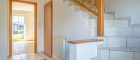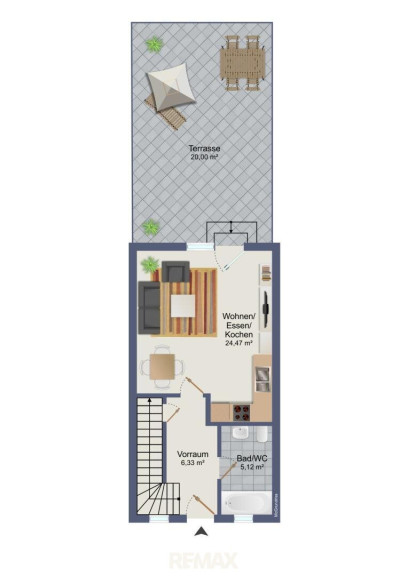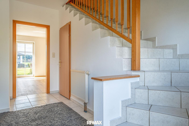 Im Erdgeschoss befindet sich der Eingangsbereich mit Aufgang ins Obergeschoss, ein praktischer Abstellraum, ein Badezimmer sowie der große Wohn-Essbereich mit Küche. Von hier aus gelangt man direkt auf die große Terrasse mit anschließendem Eigengarten – perfekt für entspannte Stunden im Freien.