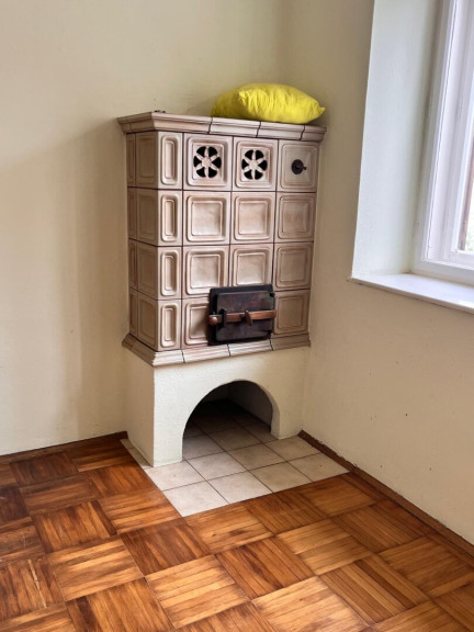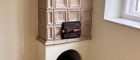 Beheizt wird mittels einem Kachelofen mit Holz!